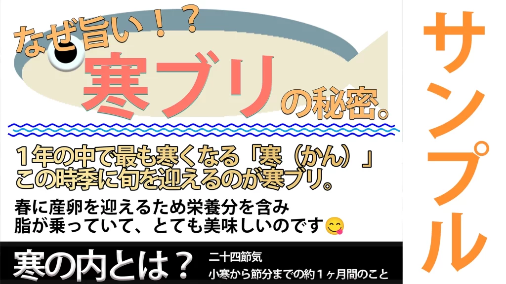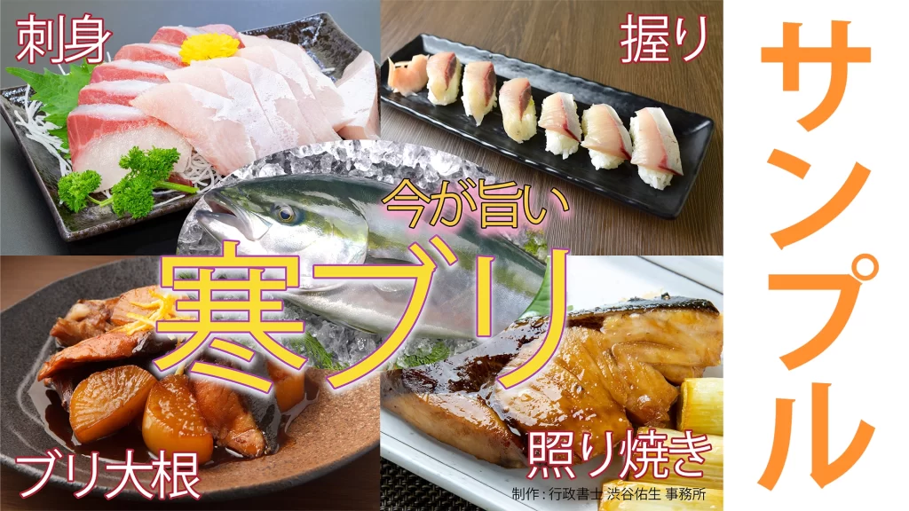 売場やメニューを彩る「寒ブリ販促POP」を作成しました。